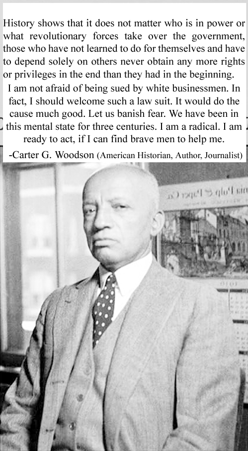 मुझे गोरे व्यापारियों द्वारा मुझ पर मुकदमा किए जाने का कोई डर नहीं है। असल में, मैं तो ऐसे मुकदमे का स्वागत ही करूँगा। इससे हमारे उद्देश्य को बहुत फायदा होगा। आइए, हम डर को अपने मन से निकाल फेंकें। हम तीन सदियों से इसी मानसिक स्थिति में जी रहे हैं। मैं एक आमूल-परिवर्तनवादी हूँ। अगर मुझे अपनी मदद के लिए कुछ बहादुर लोग मिल जाएँ, तो मैं कुछ भी करने को तैयार हूँ। -कार्टर जी. वुडसन